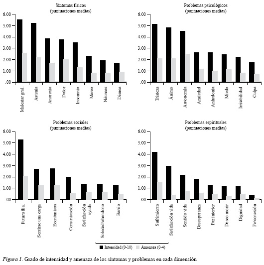 Se examinó la intensidad y el grado de amenaza de cada síntoma físico y problema psicológico, social y espiritual. Es de anotar que tanto la intensidad como el grado de amenaza promedio de las variables en todas las dimensiones fueron de moderados a bajos y ambas medidas estuvieron significativamente correlacionadas (p <.01). En la dimensión física, el malestar general, la astenia, la anorexia y el dolor tuvieron las puntuaciones más elevadas tanto en intensidad como en grado de amenaza (figura 1). En la dimensión psicológica, la tristeza, el bajo estado de ánimo y la pérdida de la autonomía fueron los problemas con mayores puntuaciones. Por su parte, en la dimensión social, la preocupación por el futuro de la familia fue el único problema con una intensidad y amenaza medias; mientras que los demás obtuvieron puntuaciones bajas. Finalmente, en la dimensión espiritual, las puntuaciones de los problemas indagados fueron, en general, de baja intensidad y baja amenaza, excepto por el grado de sufrimiento autoinformado y de insatisfacción con la vida, los cuales mostraron una intensidad moderada a baja.