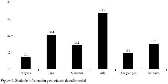 Respecto al grado de información y de conciencia de enfermedad, aproximadamente la mitad de los enfermos mostró un grado de información y conciencia de moderado a alto y solo un 7% manifestó no tener ninguna información o conciencia acerca de su enfermedad. No fue posible obtener esta información en el 15% del total de los participantes (figura 2).