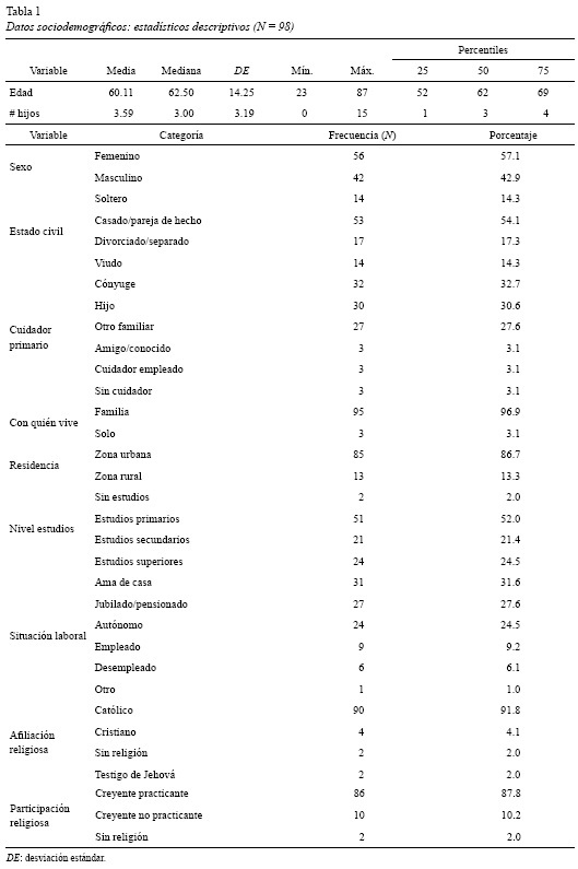 La mayoría de los enfermos residía en zonas urbanas (87%). Aproximadamente, la mitad eran de sexo femenino (57%) y estaban casados o vivían con su pareja (54%). En el 97% de los casos, vivían con la familia y los cuidadores primarios eran los cónyuges, hijos u otros familiares. La edad media de los enfermos fue de 60 años (DE = 14.25; rango 23-87).