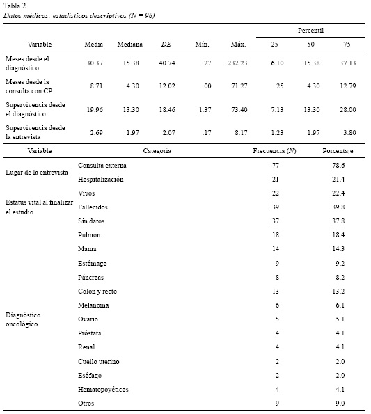 Cerca de la mitad de los enfermos tenían estudios primarios. Respecto a su situación laboral, con más frecuencia eran amas de casa, estaban jubilados o pensionados, o trabajaban de forma autónoma. En su gran mayoría indicaron ser católicos practicantes (tabla 1). La mayoría de las entrevistas fueron realizadas en la consulta externa (78.6%). Los diagnósticos oncológicos más frecuentes fueron: cáncer gastrointestinal, de pulmón, genitourinario y de mama (tabla 2). Se hizo un seguimiento del tiempo de supervivencia desde la entrevista (abril-agosto de 2011) hasta febrero de 2012. Se obtuvieron datos de 61 participantes (62%): 39 habían fallecido y 22 continuaban en seguimiento. El tiempo promedio aproximado de supervivencia desde el diagnóstico fue 20 meses, y desde la consulta, 3 meses.