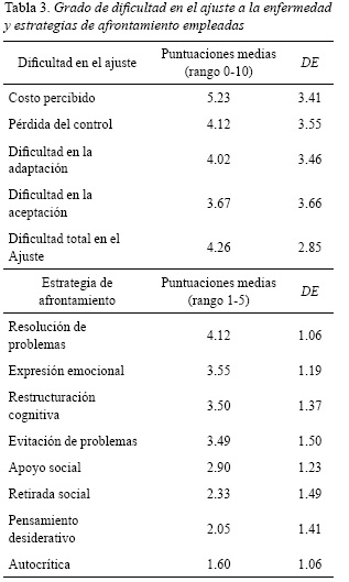 Se examinó el grado de desajuste frente a la enfermedad, obtenido a través del promedio de puntuaciones de los ítems coste percibido, pérdida del control, dificultad en la aceptación de la enfermedad y dificultad en la adaptación (alfa de Cronbach = .82). Los resultados indicaron problemas de ajuste de leves a moderados (tabla 3). De los 4 ítems que integraban esta medida, el coste percibido de la enfermedad fue el que obtuvo puntuaciones más elevadas.