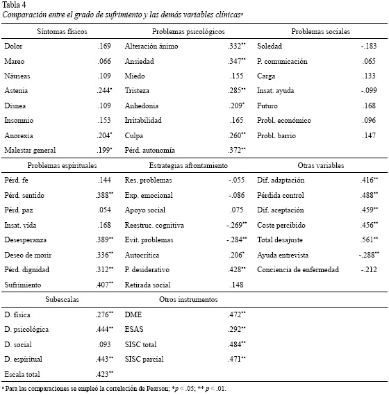 En la dimensión psicológica, la correlación fue directa y significativa con pérdida de la autonomía, ansiedad, alteración del ánimo, tristeza, culpa y anhedonia. En la dimensión espiritual correlacionó directa y significativamente con desesperanza, pérdida de sentido, deseo de morir y pérdida de la dignidad. Asimismo, el grado de sufrimiento mostró una fuerte correlación con todos los ítems que evaluaban las dificultades en el ajuste a la enfermedad, así como la medida compuesta de desajuste. En cuanto a las estrategias de afrontamiento empleadas, se observó una relación significativa y directa entre el sufrimiento y el pensamiento desiderativo y la autocrítica; mientras que la relación fue inversa con evitación de problemas y reestructuración cognitiva. No se encontró relación entre el grado de sufrimiento y el nivel de información y conciencia de enfermedad. Por otra parte, la relación entre el grado de sufrimiento y la percepción de ayuda de la entrevista fue negativa y significativa a nivel de .01, lo cual indica que a menor sufrimiento, los participantes percibieron la entrevista de mayor utilidad. Con respecto a las medidas compuestas, se encontró una relación positiva y significativa a nivel de .01 con el DME, las dos versiones del SISC y el ESAS.