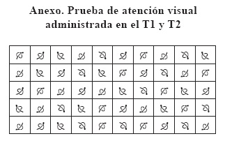 • Atención visual: se administró una prueba de atención visual adaptada de Plaza y Cohen (2006) con el objetivo de analizar la velocidad y precisión con la cual los niños eran capaces de reconocer un determinado input visual (véase anexo). Se presentaba a los niños una forma gráfica y luego una matriz compuesta por dicha forma repetida 10 veces e intercalada entre otros estímulos similares. Los niños debían marcar en la matriz impresa todos los target que pudiera identificar en un minuto.