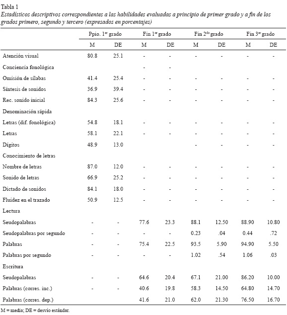 En primer lugar, se inspeccionaron las distribuciones de los puntajes obtenidos en los cuatro tiempos de evaluación. Dicho análisis permitió observar que, a principio de primer grado, las medidas que se alejaron significativamente de la distribución normal asintótica fueron las pruebas de síntesis de sonidos (Z de Kolmogorov-Smirnov = 1.650; p = .009), la prueba de reconocimiento de sonido inicial (Z de Kolmogorov-Smirnov = 2.512; p = .000) y la lectura de seudopalabras (Z de Kolmogorov-Smirnov = 2.001; p = .001). Por su parte, a fin de primer grado, las tareas que se alejaron significativamente de la distribución normal asintótica fueron las pruebas de síntesis de sonidos (Z de Kolmogorov-Smirnov = 1.721; p = .004), reconocimiento de sonido inicial (Z de Kolmogorov-Smirnov = 3.857; p = .001), lectura de seudopalabras (Z de Kolmogorov-Smirnov = 1.594; p = .012) y la escritura de seudopalabras (Z de Kolmogorov-Smirnov = 1.574; p = .014); entre tanto, a fin de segundo grado las tareas que se alejaron significativamente de la distribución normal asintótica fueron la prueba de lectura de palabras ortográficamente complejas (Z de Kol-mogorov-Smirnov = 1.622; p = .010) y la medida de tiempo de lectura de palabras ortográficamente complejas y (Z de Kolmogorov-Smirnov = 1.444; p = .031). Para corregir la falta de normalidad se transformaron las puntuaciones a su logaritmo natural; sin embargo, al no ser posible realizar dicha corrección, se utilizaron para el análisis estadístico con dichas medidas pruebas no paramétricas. Por último, el análisis de las medidas obtenidas a fin de tercer grado mostró que la totalidad de las pruebas tuvieron una distribución normal. En segundo lugar, se calcularon los estadísticos descriptivos de todas las medidas evaluadas, los cuales se expresan en porcentajes en la tabla 1.