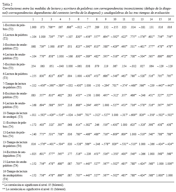 Con el fin de analizar las relaciones entre diferentes tareas (lectura y escritura de palabras y seudopalabras) entre sí, y de intentar inferir el tipo de procesamiento al que se accede en cada caso (fonológico a través de la lectura y escritura de seudopalabras y ortográfico a través de la lectura y escritura de palabras ortográficamente complejas), hecho que resulta de importancia para el análisis del desarrollo de la escritura y la lectura de palabras ortográficamente complejas, se calcularon correlaciones bivariadas (Rho de Spearman, dado que se incluyen medias que se alejaron significativamente de la distribución normal asintótica) entre las distintas pruebas de lectura y escritura administradas (véase tabla 2).