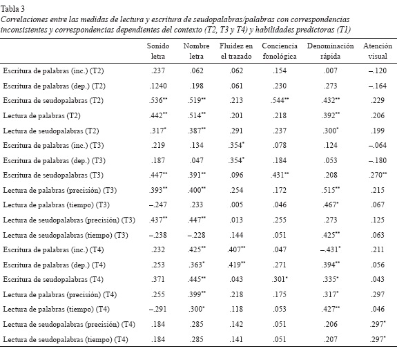 Los resultados mostraron correlaciones de mo deradas (+ .40 a + .60) a altas (+ .60 a + .80, según Maisto & Morris, 2001) entre todas las medidas de escritura y lectura de los tres tiempos de evaluación. Se observó que a fin de primer grado las correlaciones entre las pruebas que incluían palabras y seudopalabras fueron altas (r = .706 y p = .001 para la escritura y r = .658 y p = .001 para la lectura). Este nivel de correlación sugiere que ambos tipos de ítems se estaban procesando en ese momento mediante el mismo tipo de mecanismos, es decir, accediendo a recursos fonológicos. Al finalizar tercer grado, sin embargo, las correlaciones entre las pruebas que incluían palabras y seudopalabras obtuvieron correlaciones más bajas (r = .540 y p = .001 para la escritura y r = .538 y p = .001 para la lectura), hecho que sugiere que el procesamiento fonológico implicado en la lectura de seudopalabras comienza a diferenciarse del procesamiento al que acceden los niños en este momento del desarrollo para leer palabras (procesamiento léxico).Respecto de las correlaciones de las habilidades de lectura y escritura de palabras y seudopalabras con las habilidades predictoras, los resultados señalan que el conocimiento de las letras correlacionó de manera significativa con la mayoría de las habilidades de lectura y escritura en todos los tiempos evaluados; mientras que la medida de conciencia fonológica correlacionó con la escritura de seudopalabras de fin de primero (r = .544; p = .001), segundo (r = .431; p = .001) y tercer grados (r = .301; p = .005). Por otro lado, la fluidez en el trazado de las letras se correlacionó con las medidas de escritura de palabras y correspondencias inconsistentes y dependientes del contexto de fin de los grados segundo y tercero (r = .354 y p = .005 entre la fluidez en el trazado de las letras y la escritura de correspondencias inconsistentes de segundo; r = .354 y p = .005 entre la fluidez en el trazado de las letras y la escritura de correspondencias dependientes del contexto de segundo; r = .407 y p = .001 entre la fluidez en el trazado de las letras y la escritura de correspondencias inconsistentes, y r = .419 y p = .001 entre la fluidez en el trazado de las letras y las dependientes del contexto de tercer grado). Asimismo, la medida de denominación rápida correlacionó de manera significativa con el tiempo de lectura de fin de los grados segundo (r = .425 y p = .001) y tercero (r = .427 y p = .001) (tabla 3).
