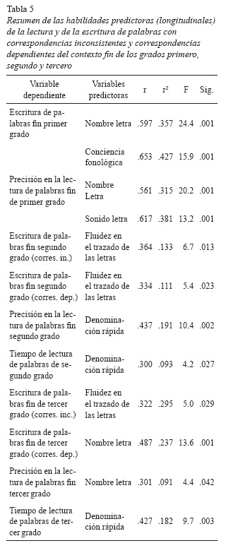 En cada una de las regresiones se introdujo una de las pruebas de escritura (de correspondencias inconsistentes o dependientes del contexto) y precisión y tiempo de lectura de palabras de los grados segundo y tercero como variable dependiente (salvo a fin de primer grado, que se introdujo en la medida de escritura sin disociar entre tipos de correspondencias por haberse perdido las correlaciones). Las variables independientes introducidas fueron las habilidades de denominación rápida, conciencia fonológica, fluidez en el trazado de las letras, conocimiento de las letras y atención visual, administradas a principio de primer grado, por lo que se obtuvieron predictores longitudinales de las medidas de aprendizaje ortográfico de fin de segundo y tercero (tabla 5).