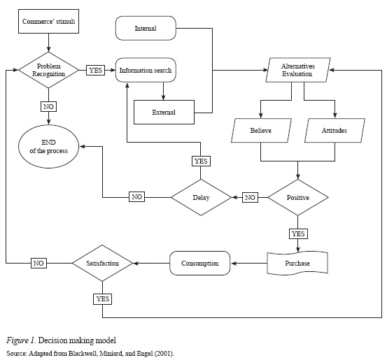The model involves five stages: (1) Problem-recognition, (2) search for information, (3) alternatives evaluation, (4) choice, and (5) outcomes. The two lasts ones can be read as purchase and consumption/satisfaction, in this case. Figure 1 describes the underlying algorithm.