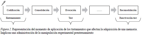 Tradicionalmente, se consideró a estas tres fases las relevantes para la formación de recuerdos, sin embargo, múltiples estudios dan cuenta de que es posible manipular memorias ya formadas mediante la fase que hoy día se conoce como reconsolidación. Esta última implica un periodo de labilización de memorias ya formadas, por medio de un proceso de reactivación en el que se vuelven a presentar claves que ya habían estado presentes en la consolidación, haciendo susceptibles de manipulación dichos aprendizajes (Debiec & Ledoux, 2004). Los tratamientos experimentales que se apliquen luego de la reactivación permiten arrojar información acerca del proceso de reconsolidación (ver figura 1).