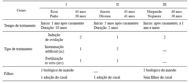 Dos casais entrevistados, todos os cônjuges dos Casais I e II tinham nível superior completo e empregos públicos estaduais e municipais. Estes fizeram os tratamentos na rede especializada privada para reprodução assistida. No Casal III, a esposa tinha nível superior completo, exercia atividade autônoma e o marido, o primeiro grau incompleto e exercia atividade laboral como auxiliar de direção. Eles estavam fazendo o tratamento na rede pública de saúde.