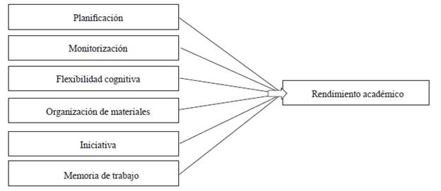 Luego de analizada la relación entre las variables funciones ejecutivas y rendimiento académico, se propuso un modelo de regresión múltiple (considerando solo las funciones ejecutivas que resultaron estadísticamente significativas en el análisis de correlación), en el cual se identificó el porcentaje que las funciones ejecutivas (consideradas predictores) explican la varianza del rendimiento académico (considerado variable dependiente). En la figura 1 se presenta de forma gráfica el modelo testeado, en el que se hipotetiza que la planificación, la monitorización, la flexibilidad cognitiva, la organización de materiales, la iniciativa y la memoria de trabajo tendrían una relación causal sobre el rendimiento académico.