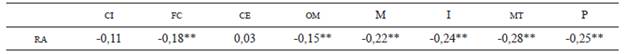 La correlación es significativa a nivel 0,01 (bilateral). RA = rendimiento académico; CI = control inhibitorio, FC = flexibilidad cognitiva; CE = control emocional; OM = organización de materiales; M = monitorización; I = iniciativa; MT = memoria de trabajo; P = planificación. El coeficiente de correlación negativo manifiesta una relación estadística inversamente proporcional entre las variables, que significa que a mayor déficit de las funciones ejecutivas, menor es el rendimiento académico.