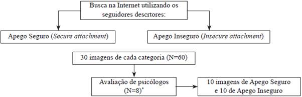 A seleção das imagens relacionadas ao apego foi realizada na internet no banco de imagens com licença aberta do Google®. A opção de busca na internet foi intencional, pois não foram encontradas imagens de apego já validadas para estudos experimentais. A figura 1 ilustra o processo de seleção das imagens.