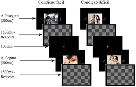O experimento iniciava com dois blocos de treinamento contendo 20 imagens controle (neutras, sem valência emocional) cada. As imagens neutras foram obtidas no banco de imagens do IAPS -International Affective Picture System- (Lang, 1995). No treino, os participantes recebiam feedback sobre o Tempo de Resposta (TR), a acurácia e ausência de reação. A coleta dos TR dos participantes tinha início depois do bloco de treino, sem feedback. No experimento, havia 4 blocos de 20 imagens cada, dois blocos equilibrados entre imagens neutras e imagens de apego seguro (AS) e dois blocos equilibrados entre imagens neutras e de apego inseguro (AI). Haviam dois modelos, fácil e difícil, sendo que cada um continha um bloco AS e um AI. No modelo fácil havia uma diferença visível entre as barras, de 90°, e no modelo difícil havia uma diferença sútil entre as barras, de 6°. A ordem de apresentação dos 4 blocos foi randomizada entre os participantes. A condição difícil foi inserida na tarefa apenas para manter a atenção do participante e evitar distratores (Lavie, 2005).