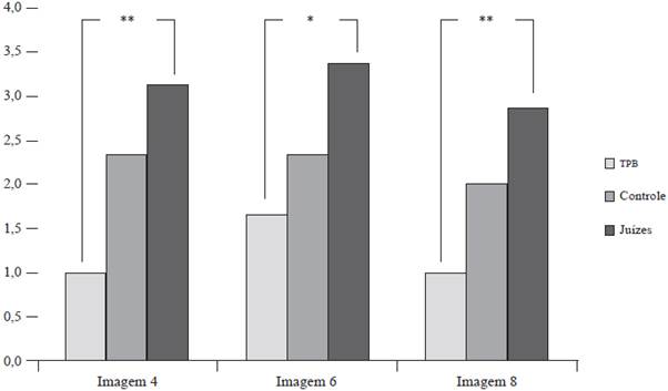 Nota: Valores mais próximos de zero indicam apego inseguro. A imagem 6 foi avaliada como diferente entre os grupos, * p < .05. O grupo de TPB avaliou as imagens 4 e 8 como mais indicativas de um apego inseguro que os juízes, ** p < .0025.