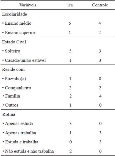 Todos os pacientes com TPB faziam psicoterapia (M = 6.93 anos, DP = 5.567) durante a coleta de dados em 2015, sendo que cinco realizavam também algum tratamento farmacológico concomitante.