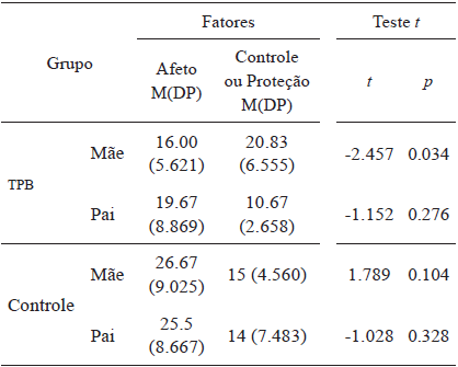 Para entender os efeitos da interação e especificar em quais das duas dimensões e em qual figura parental houve diferença entre os grupos, foi realizado um Teste t para amostras independentes, revelando assim uma diferença significativa no valor das médias da dimensão de afeto na figura parental da mãe (t [2.457] = 8.372, p = 0.034, d = 3.52). Estes resultados revelam que a dimensão de afeto da figura parental da mãe foi o principal fator de diferenciação entre os grupos com relação à escala IVP. A tabela 2 mostra a média dos escores das dimensões da escala IVP para o grupo com TPB e controle e os valores da comparação entre grupos.
