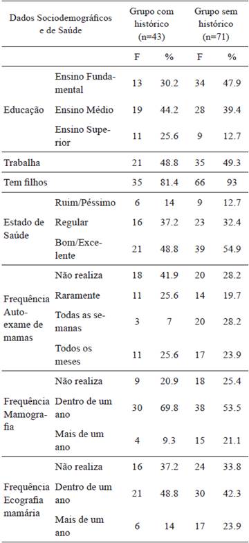 A amostra total (n=114) foi dividida em dois grupos: mulheres com histórico familiar de câncer de mama (HF) e mulheres sem o histórico familiar da doença (SHF) (n=71). No grupo HF (n= 43) as mulheres apresentavam idade média de 48.21 anos (DP=11.91), sendo que a maioria delas mulheres não possuía companheiro fixo, 62.8% (n= 27). Entre o grupo, 51.2 % (n=22) apresentaram parentesco em primeiro grau (mãe e irmã) com familiares diagnosticadas com CM. Outras 48.8 % (n=21) referiram ser parentes em segundo e terceiro grau (avó, tia e prima). O diagnóstico e tratamento do familiar foi acompanhado por 55.8% (n=24) das participantes, as quais, tinham em média 34.8 anos (DP=13, 49) nesta época. A idade da primeira mamografia das participantes do grupo foi aos 34, 95 anos (DP=8.42), com frequência média de realização anual 69.8% (n=30).