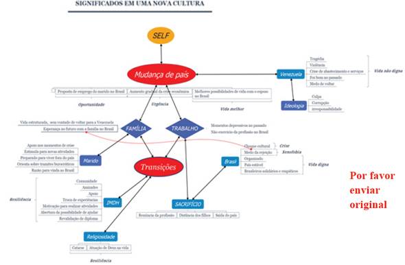 Os significados que orientam os movimentos de transição foram: o sacrifício, que marca e regula a relação entre família e trabalho; e o IMDH, cujo apoio se relaciona à dificuldade de atuação profissional e aos momentos de crise. Os significados de IMDH e de Brasil orientam novas atuações da participante orientados à resiliência, relacionada também, ao significado religiosidade e à vida digna. Os sentidos enunciados sobre a Venezuela, como tragédia e violência, ocorrem relacionados a posicionamentos ideológicos orientados por interpretações de perda da dignidade na vida e ao desejo de não retornar ao país de origem. O processo de convencionalização, define-se pelo ir e vir de um país para o outro, pela vida difícil na Venezuela e pela vida no país de chegada, com as práticas culturais diferenciadas que devem ser aprendidas. A continuidade de si é expressa em atos de identificação entre seu país de origem, práticas culturais conhecidas e o país de destino com novas práticas.