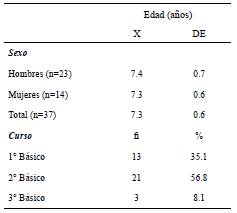 La tabla 1 presenta la caracterización de la muestra estudiada, en la que fueron evaluados un total de 37 estudiantes (23 hombres y 14 mujeres) de educación básica, diagnosticados con FIL, pertenecientes a los PIE de la ciudad de Talca.