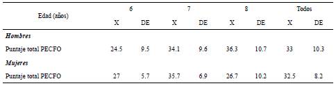 Tabla 3 Valores medios y DE de los ítems correspondientes a conciencia silábica y conciencia fonémica de hombres y mujeres con relación a la edad cronológica, según resultados obtenidos de la aplicación de PECFO