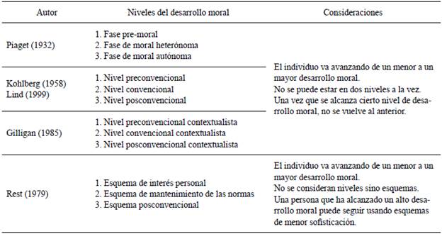 Tabla 1 Clasificación de los niveles de desarrollo moral en cinco teorías