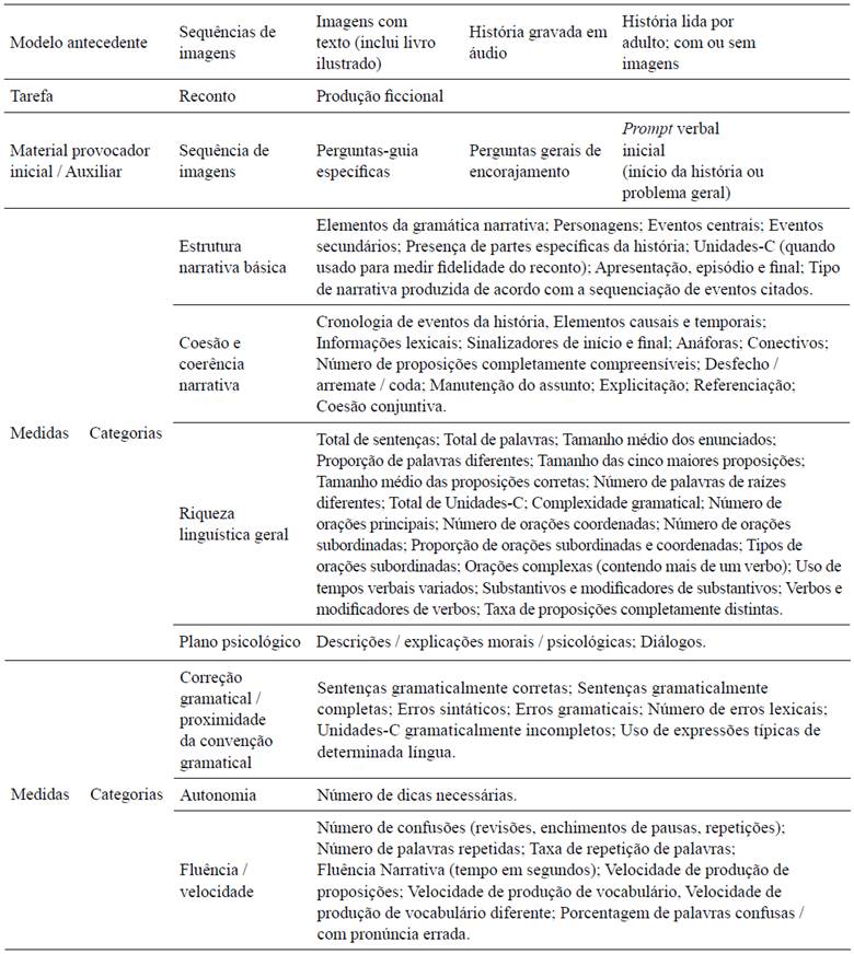 Conforme pode ser visto na tabela 2 algumas avaliações incluem um modelo antecedente, outras não. Os modelos antecedentes podem ser, por exemplo, uma história lida pelo experimentador ou uma sequência de imagens mostrada à criança. A partir do modelo antecedente, é solicitada a tarefa à criança, que abarca, por exemplo, o reconto ou produção de uma narrativa. Em alguns casos, a criança pode contar com a ajuda de algum material para construir sua narrativa, por exemplo, folhear as imagens de um livro ilustrado. Em outros, o material só está disponível antes de a criança iniciar sua narração.