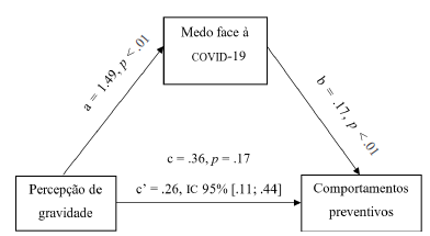 Figura 1 Análise de mediação do medo face à COVID-19 na associação entre a percepção de gravidade e os comportamentos preventivos