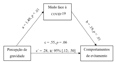 Figura 2 Análise de mediação do medo face à COVID-19 na associação entre a percepção de gravidade e os comportamentos de evitamento
