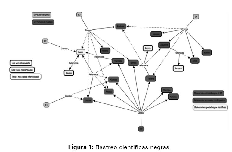 Ocho (8) de las científicas negras, eran conocidas de antemano por el grupo de trabajo de la investigación, de ellas cinco (5) fueron igualmente referenciadas por los expertos y expertas consultados; estos por su parte aportaron seis (6) nuevas referencias y las referencias semillas aportaron cuatro (4). Cinco (5) de las científicas identificadas fueron nombradas tres veces tanto por las otras científicas como por las/los expertos consultados. Seis (6) de ellas fueron nombradas 2 veces, y ocho (8) 1 sola vez. El siguiente diagrama (figura 1) resume lo aquí dicho: