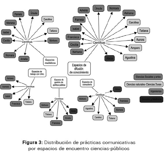 Siguiendo esta argumentación, encontramos que los tres ejemplos arriba mencionados ratifican sólo de alguna manera nuestro supuesto inicial. Al tomar en consideración las posiciones diversas que cada una de estas investigadoras ocupa en el campo científico –Úrsula en el centro, Francisca en la parte media e Isabel en la periferia–, podemos notar que Úrsula se vincula con menos espacios de encuentro con sus públicos –respecto a Francisca e Isabel que están presentes en todas las otras esferas (ver gráfica 3). Así mismo, se puede observar que estos espacios de encuentro al ser mediáticos y de difusión están más directamente articulados con su trabajo investigativo, con respecto a las iniciativas comunicativas de Francisca e Isabel que están más cercanas a actividades de movilización social y trabajo comunitario. Sin embargo, ha sido Úrsula quien referenció a estas científicas que están en la periferia (ver figura 1) y que se encuentran vinculadas más directamente con colectivos de base. En este sentido, ellas como científicas se encuentran conectadas entre sí.