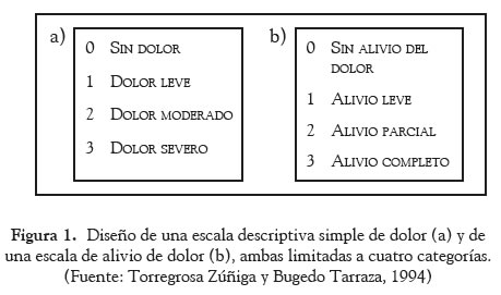 En la medicina clínica existen diversos métodos para cuantificar el dolor. Sin embargo, todos poseen cierto esquema básico y lo que varía es la forma de representarlo. En este caso, solo tomaré las escalas empleadas en la medicina clínica y no las escalas utilizadas en investigaciones experimentales sobre el dolor físico. Los métodos más comunes pueden ser agrupados bajo tres categorías generales: (i) Los informes subjetivos, (ii) la medición y observación de la conducta dolorosa y (iii) las correlaciones fisiológicas. Me centraré en el primero de ellos, el cual presenta a su vez distintos tipos de escala, así: