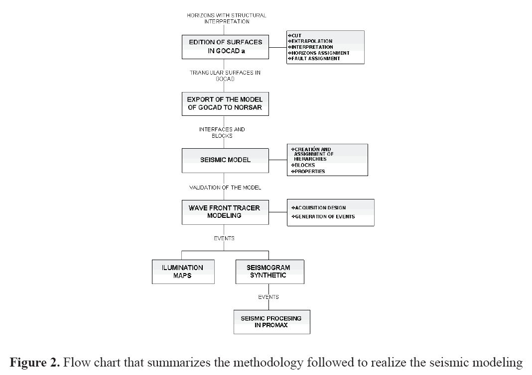 A methodology has been applied in order to use seismic modeling and generate synthetic data which are compared with results from field data. This methodology has been applied to the Sirirí area and subsequently it has been extended to other geographic areas. To fully develop this methodology, the GOCAD and 3D NORSAR software packages were used to build respectively the geological and 3D seismic models. This methodology involves making structural modeling by edition of the different objects (horizons and faults) in the structural module of GOCAD, with the help of available seismic and well data, in order to be consistent with reality. From this result a valid seismic model is imported to NORSAR 3D for making the seismic modeling, using ray tracing to get synthetic data. Finally, this information is compared with field data that has been processed.