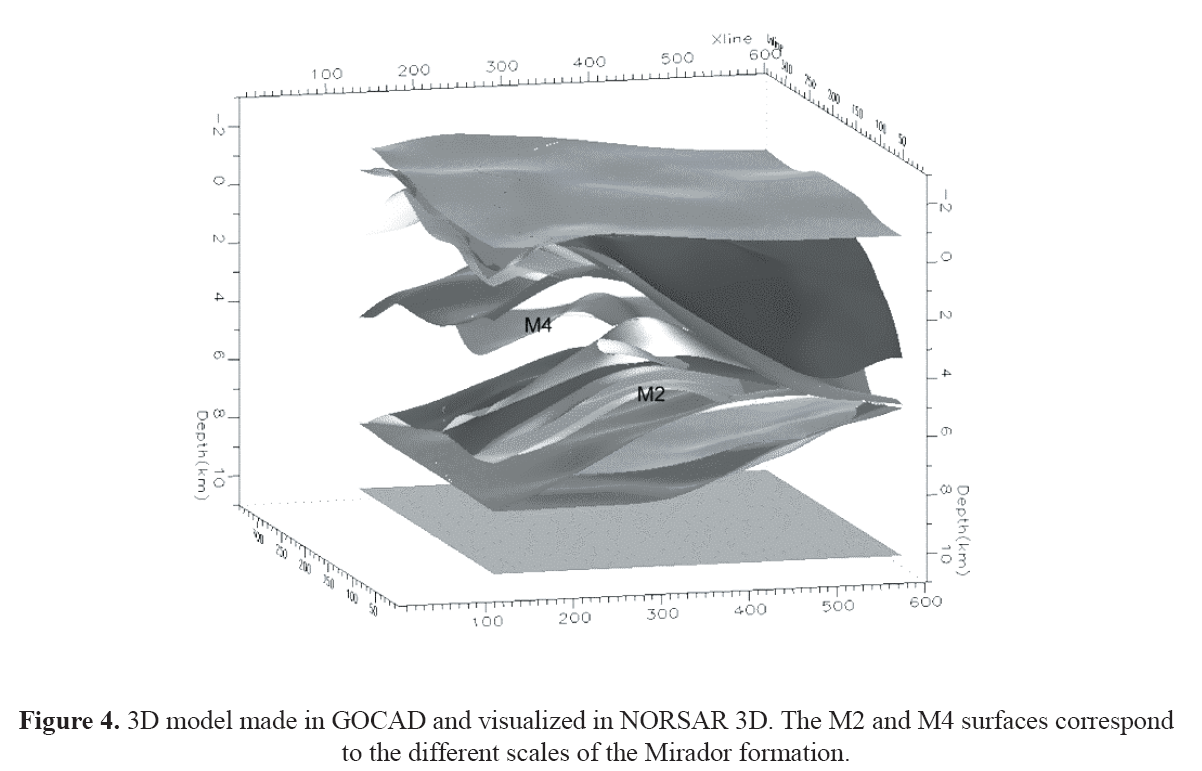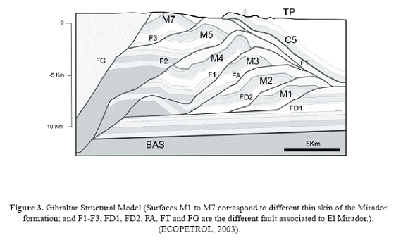 The exploratory objective was to illuminate the Gibraltar structure in the Mirador formation. Initially, the horizons and interpreted faults were imported and associated to the different thin skins of the Mirador formation, in the Earth Science Decisions' GOCAD software. GOCAD is one of the latest state-of-the-art computational integrated applications, in which advanced capacities for 3D modeling, visualization, and geoanalysis are offered. This software has a huge advantage in the integration of information from external sources, and possesses the capacity to export into other applications such as the NORSAR's NORSAR 3D software, where seismic modeling is realized (Earth Science Decisions, 2005).