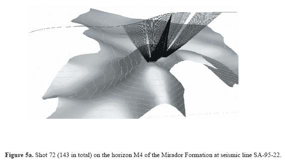 The tracer was configured to simulate the wave propagation of the Mirador horizon (M4 and M2 mainly) and the deeper (Figure 5). This configuration is called signature and usually uses the velocities of the P waves. Only waves reflected by this horizon are used.