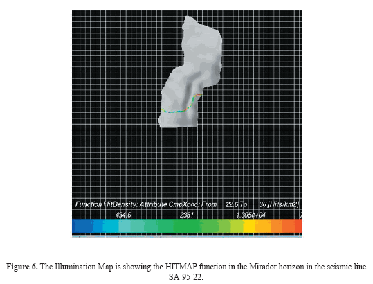 The illumination maps evaluate the design of seismic acquisition on the horizon of interest (e.g., the Mirador Formation). These maps are built in the NORSAR 3D using the events registered in the seismic modeling. Several functions can be visualized on the illumination maps like the HITMAT function, equivalent to the seismic fold, which shows the effectiveness of the seismic design according to the parameters required (Figure 6).