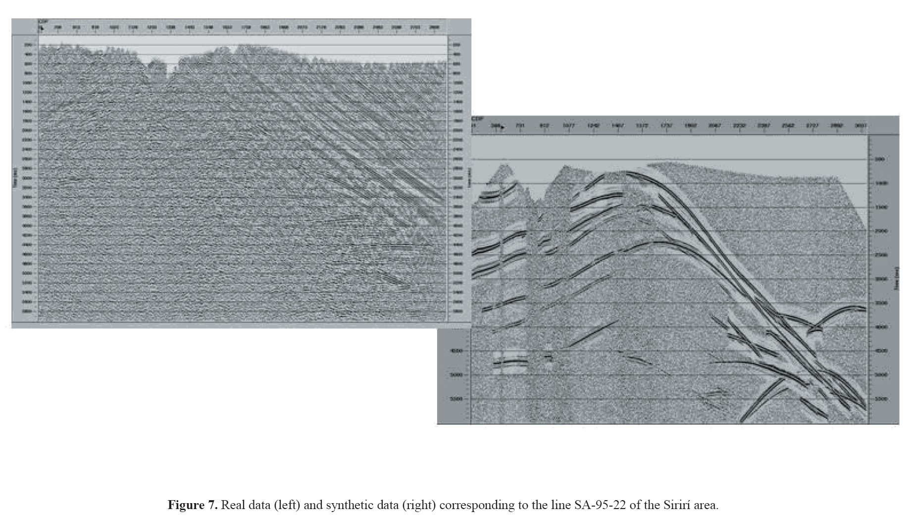 Seismic modeling using the methodology described is an excellent tool for the validation of the 2D or 3D seismic designs and it is adequate to use it on complex areas, as the Colombian Llanos foothills. The complexity of this area makes necessary to use this method. An example of this is observed on the comparison between the images obtained from field data and the ones obtained from synthetic data (Figure 7).