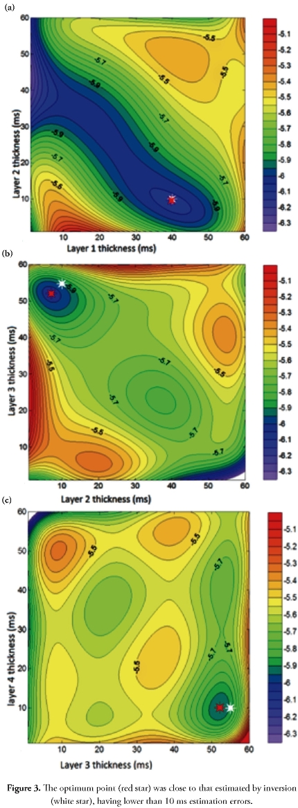 Figure 3 shows the cost function pattern calculated for a couple of layers where inversion-estimated values were close to optimum values, having lower than 6 ms estimation errors.