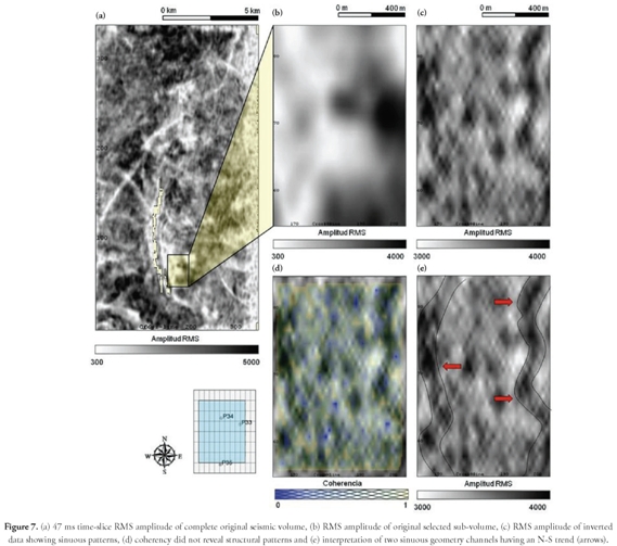 RMS amplitude and seismic volume coherence were calculated before and after inversion. The RMS amplitude 47 ms time-slice is shown in Figure 7a, a box limiting the zoomed-in area. RMS amplitude 17 ms time-slice and inverted data coherence are shown in Figures 7b and 7c, respectively, where the RMS image shows an N-S sinuous continuity pattern to the east, interpreted as being a small meandering distributary channel which was consistent with the ICP palaeoenvironmental interpretation (2006) and supported by core analysis of well P33 drilled in the channel. Another sinuous pattern observed to the west was interpreted as a meandering channel; by contrast, these patterns were not observed in RMS amplitude before inversion (Figure 7b), probably due to the tuning thickness effect.