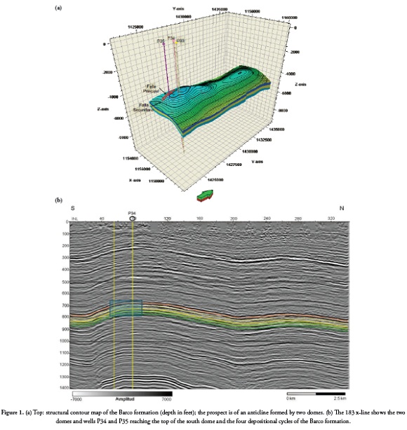 Two folds have been interpreted in the area (Ojeda et al., 2009); a syncline has been located in the western part by the 3D seismic programme, followed by an anticline structure in the eastern part consisting of two domes. A main fault and secondary fault to the east of the former separate these two domes' structures (Figure 1A). Wells P33, P34 and P35 reach the top of the Barco formation on the south dome. This formation is divided into four depositional cycles, each representing a maximum flooding surface and hence stratigraphic limits. Figure 1B shows x-line 183 where the Barco formation and the four depositional cycles link wells P34 and P35.