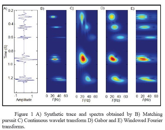 A synthetic seismogram was created by superposing three traces. The first trace by convolving a 0°- 20 Hz Morlet wavelet with 1 and -1 reflection coefficients at 0.3 and 0.9 S, the second by convolving a 45°- 30 Hz Morlet with 1, 1 and 1 reflection coefficients at 0.45, 0.93 and 1.2 S, and the third by convolving a 90°- 50 Hz Morlet with 1 and -1 reflection coefficients at 0.6 and 1.23 S. In figure 1A, three Morlet wavelets at 0.3, 0.45 and 0.6 S are clearly separated, and also two wavelets at approximately 0.9 and 1.2 S where it is hard to discern the two close events, at 0.9 and 0.93 S, and 1.2 and 1.23 S. To compare the performances of Matching Pursuit (MP), Continuous wavelet (CW), Gabor (G) and windowed Fourier (WF) transforms, the synthetic seismogram was spectrally decomposed by the four methods. The supplied MP, CW, WF and G spectra are shown in figures 1B, 1C, 1D and 1E. As a result, the 20, 30 and 50 Hz bandwidths are best defined in the MP spectrum, besides a better time resolution of the reflectors at 0.3, 0.45, 0.6, 0.9, 0.93, 1.2 and 1.23 S. On the other hand, the WF spectrum strongly depicts Gibbs phenomena as a consequence of the windowed effects, even at 0.3, 0.45 and 0.6 S.