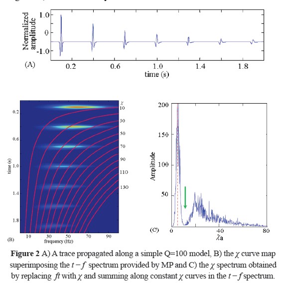 Next, a blocky model with Q = 100 constant in depth was made, along which a plane wave traveling generates the attenuated synthetic seismogram of Figure 2A. This seismogram was MP decomposed, providing the t-ω spectrum shown in Figure 2B.