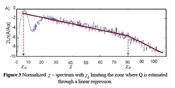 The maximum amplitude in the spectrum of Figure 2C is set to χ0 = 4. Ahead of the highest peak of the χ spectrum, a very low amplitude zone around χ =10 is observed, which agrees with the low energy content in the vicinity of the χ =10 curve as is shown by the t−ω spectrum of Figure 2B. The χ spectrum is normalized in a new one, see Figure 3, where all values are negative and with the highest value around χ =5. The slope is steepest after χb = 80, a value that defines the superior limit of the interval along which Q is estimated. Tiny values after χb = 80, are rejected because they are associated to numerical noise observed in Figure 2C. A linear regression provided a value of 16.1 for the inverse of the slope that scaled by 2π gives a Q value of 101.16, which is close to 100.