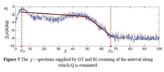 The same seismogram was decomposed by WFT and GT supplying the respective χ spectra, observed in Figures 4 and 5. WFT and GT χ spectra depict a similar pattern that differs from the MP χ spectrum. In both new spectra, the low amplitude zone around χ =10 is not observed, and instead is full of spurious amplitudes. In addition, the absence of a linear decreasing trend in both spectra increases the uncertainty to estimate Q. In an attempt to estimate Q, some χ values were excluded to achieve a linear trend. In the WFT case, a Q value of 193.9 was obtained, and in the GT case a value of 134, both considered very inaccurate.