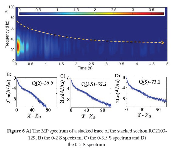 The preceding procedure was applied to the migrated offshore section RC2103-129 of the Caribbean Colombia basin, formed by a siliciclastic Neogene sequence that overlays a carbonate and siliciclastic Paleogene sequence. A trace of this section was decomposed by MP, and its spectrum shown in Figure 6A. The 0-2S, 0-3.5 S and 0-5 S intervals were considered to estimate their associated average quality factors. Their respective χ - spectra are shown in figures 6B, 6C and 6D, on which linear regressions provided ‹Q› values of 39.9, 55.2 and 73.1, respectively. Using equation 9, interval Q values of 39.9, 113.5 and 296.3 related to the 0-2S, 2-3.5 and 3.5-5S intervals were obtained, with these values being in agreement with Q measurements reported for this lithology.