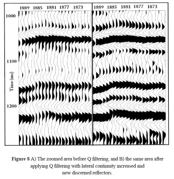 Next, Q values were estimated at 0.5, 1.5, 2.5, 3.0, 3.5, and 4.5 seconds in the migrated section, and in order to consider the Q lateral changes it was estimated in positions separated forty CDPs. The final Q model was achieved by smoothing laterally the obtained attenuation factors. An inverse Q-filter was developed and implemented in Matlab, which includes a stabilization factor σ compensating for the amplitudes according to equation 13. The filter was applied to the above section, and as a result, a higher resolution image was achieved, as observed in Figure 7B. The seismic events in the Q filtered image look sharper, with a better lateral continuity than those in the former section and are reliable due to the trace by trace approach of the applied inverse Q filter. An area, from 1000 to 1300 ms and between the CDPs 1870 and 1890, was selected to observe the Q-filtering performance.