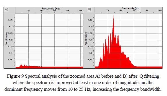 Figures 8A and 8B show the zoomed areas before and after applying the inverse filter. The seismic events between 1050-1100 ms and 1150-1200 ms look clearly separated after Q inversion, whereas the weak event between 1100-1150 ms becomes stronger with an observable lateral continuity not visible before. After Q filtering, the image depicts higher amplitudes and better lateral continuity than before Q filtering. A spectral analysis was performed in the limited area. Figures 9A and 9B show the amplitude's spectra before and after applying the Q filter. After Q filtering, the spectrum increased in one order of magnitude, and the dominant amplitude moved from 10 Hz in the stacked section, to 28 Hz. Moreover, frequency content above 30 Hz was recovered increasing the frequency bandwidth.