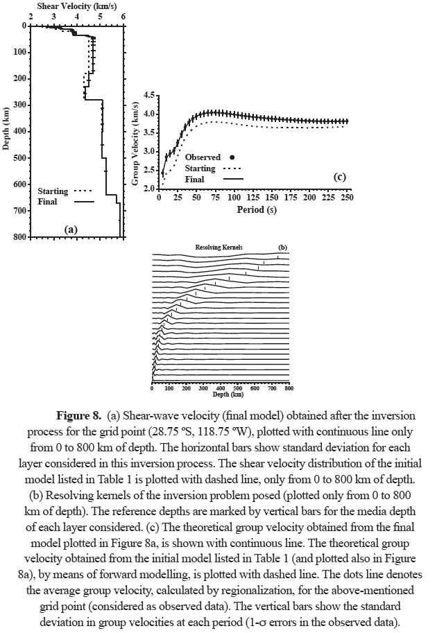 Resolution of the final model. The resolving kernels shown in Figure 8b indicate the reliability of the solution obtained for the inverse problem posed. A good engagement between the calculated solution and the true solution (which implies the reliability of the estimated solution), is obtained when the absolute maxima of these functions fall over the reference depths. This reliability is also related to the width of these absolute maxima. The solution for the inversion problem is more reliable when the maxima of these resolving kernels are narrower. The S-velocity models (Figure 8a) and the resolving kernels (Figure 8b), are plotted only for depths above 800 km. This fact is due to the bad resolution obtained for depths deeper than 400 km. Figure 8b shows that the deeper layers (below 400 km) have a poor resolution. This is shown in the lack of coincidence between the resolving-kernel absolute maxima and their reference depths, for depths down to 400 km. Therefore, the results obtained for depths below 400 km have been left out, because the resolution at these deeper depths is poor. For depths of 0 to 400 km, the S-velocity models must be considered as valid models. Thus, the S-velocity final model shown in Figure 8a (continuous line), is the S-velocity distribution with depth obtained for the grid point with geographical coordinates (28.75°S, 118.75°W).