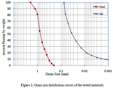 Soil samples from the coastal region of Mostaganem were collected at various depths. In these samples, the silty fines content did not exceed 30%. In our experiments, the sand and silt were separated and used to generate the test specimens. The specific gravities of the sand and silt were 2.67 and 2.69, respectively. The tests were conducted on mixtures of the collected sand and silt. The plastic limit and liquid limit of the silt were 20% and 25%, respectively. Because most static liquefaction and earthquake-induced liquefaction occur in silty sand and sandy silt, silt contents ranging from 0% to 40% were tested. Additionally, liquefaction vulnerability is highly affected by the relative density of the soil (Yamamuro and Kelly, 2001; Maheshwari and Patel, 2010). In this work, a variety of soil density states were also studied. The geotechnical properties of the soil used in this work are presented in table 1.