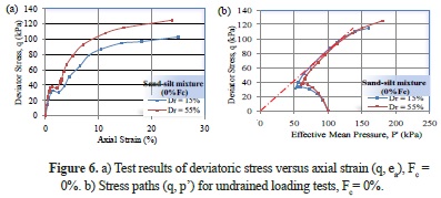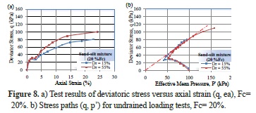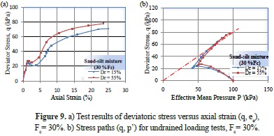 We observed that an increase in the amount of fines of 0% to 30% leads to a decrease in the deviatoric stress. This decrease occurs because of the role of the fines in reducing the soil dilatancy and amplifying the phase of contraction in the sand-silt mixtures, which leads to a reduction in the confining effective pressure and, consequently, a decrease in the peak strength of the mixtures. The stress path in the (p', q) plane clearly shows the role of the fines in the decrease in the average effective pressure and the maximum deviatoric stress (Figures 6.b-10.b). In this case, the effect of fines on the undrained behavior of the mixtures is observed for the fines contents lower than 30%. These results are in good agreement with the observations of Shen et al. (1977), Troncoso and Verdugo (1985), Koester (1994) and Kokusho et al. (2014).